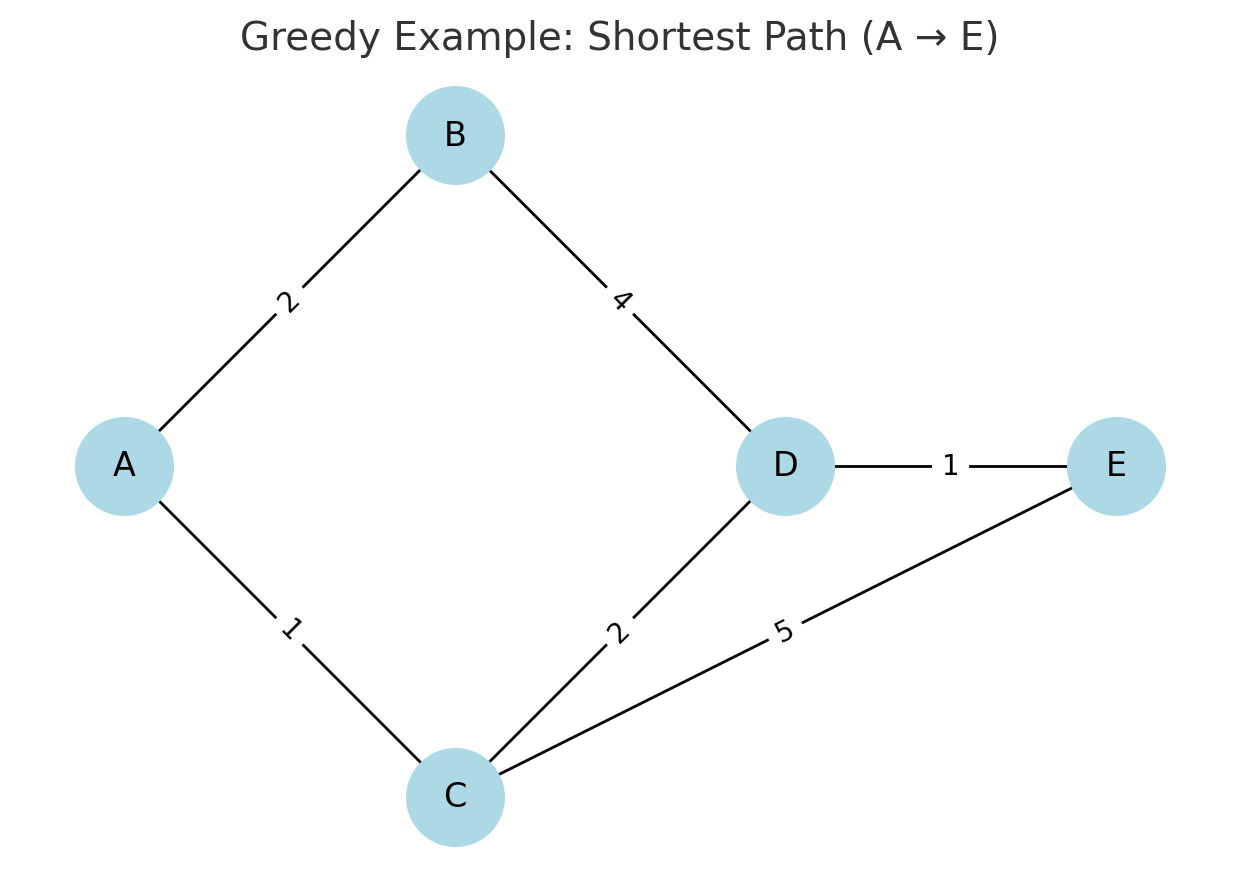 如果想要找到 A → E 的最短路徑,從 A 出發會先選 1 到 C 因為比 2 小,到 C 後再選 2 到 D 因為比 5 小,最後路徑是 A→C→D→E,長度 4。
