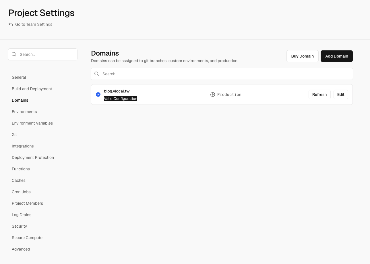 到 Project Settings > Domains 去新增最後希望的自訂網域,比如說我這次就會新增 blog.viccai.tw。