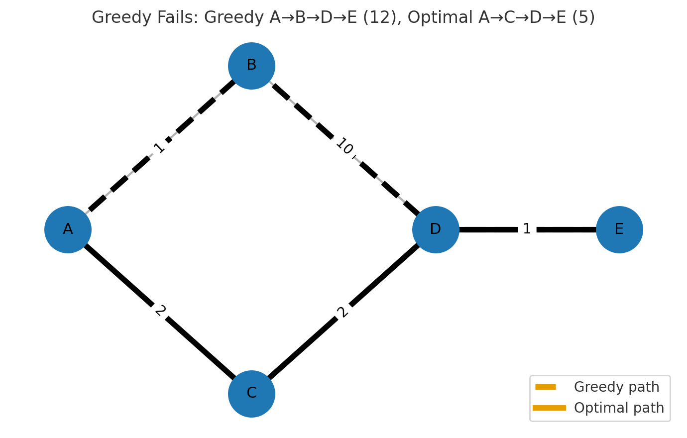但會發現這並不是最佳解,因為如果走另一個 A→C→D→E 只有 5,有些狀況當下最好的選擇但不是最終最佳的選擇。